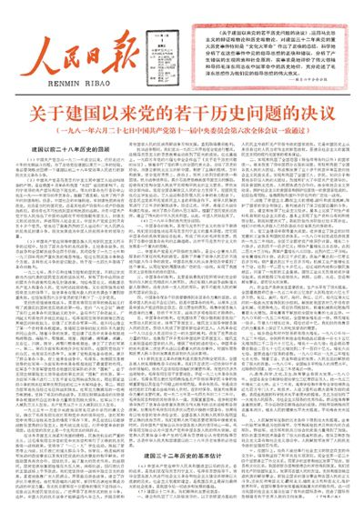 1981年7月1日,《人民日報》刊發《關于建國以來黨的若干歷史問題的決議》。資料照片