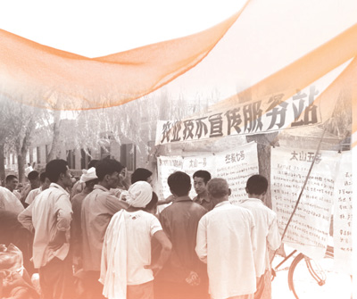 1981年9月,河北臨西縣實行包產到戶后,農技推廣站在集上銷售種子、農藥,許多農民前來咨詢農業技術問題。蔣 鐸攝(影像中國)