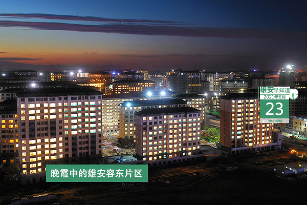 今天是2021年6月23日,星期三,天氣陰,21℃~31℃。在封面和大家見面的是晚霞中的雄安容東片區。