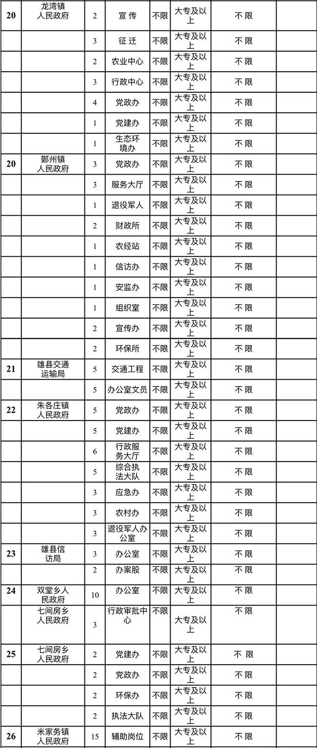 為充分利用公益性崗位促進就業困難高校畢業生就業,更好地為高校畢業生提供提升工作能力、積累工作經驗,增強就業競爭能力的機會,有效緩解我縣機關事業單位人員緊缺的壓力,根據河北雄安新區管理委員會公共服務局、河北雄安新區管理委員會改革發展局《關于加強雄安新區公益性崗位開發管理工作的通知》(雄安公服發[2020]107號)精神,結合我縣實際,擬選聘一批高校畢業生從事公益性崗位,現將有關事宜公告如下: