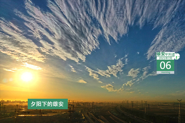 今天是2021年7月6日,星期二,天氣陣雨轉多云,23℃~30℃。在封面和大家見面的是夕陽下的雄安。