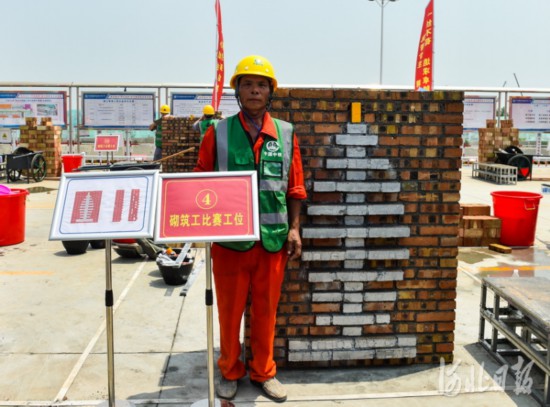 2021年7月7日,參加砌筑工職業技能大賽的選手與自己的參賽作品合影。