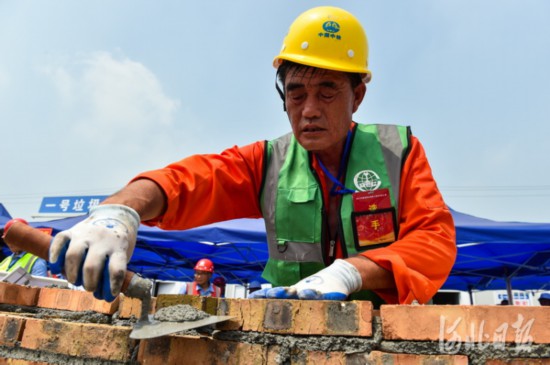 2021年7月7日,參加砌筑工職業技能大賽的選手在比賽中。