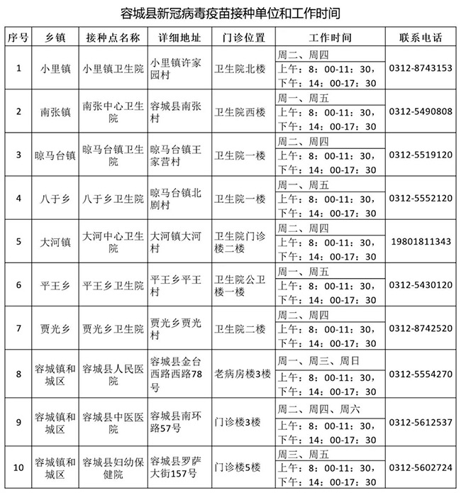 9、雄安容城縣新冠病毒疫苗接種單位和工作時間調整。調整如下↓↓↓