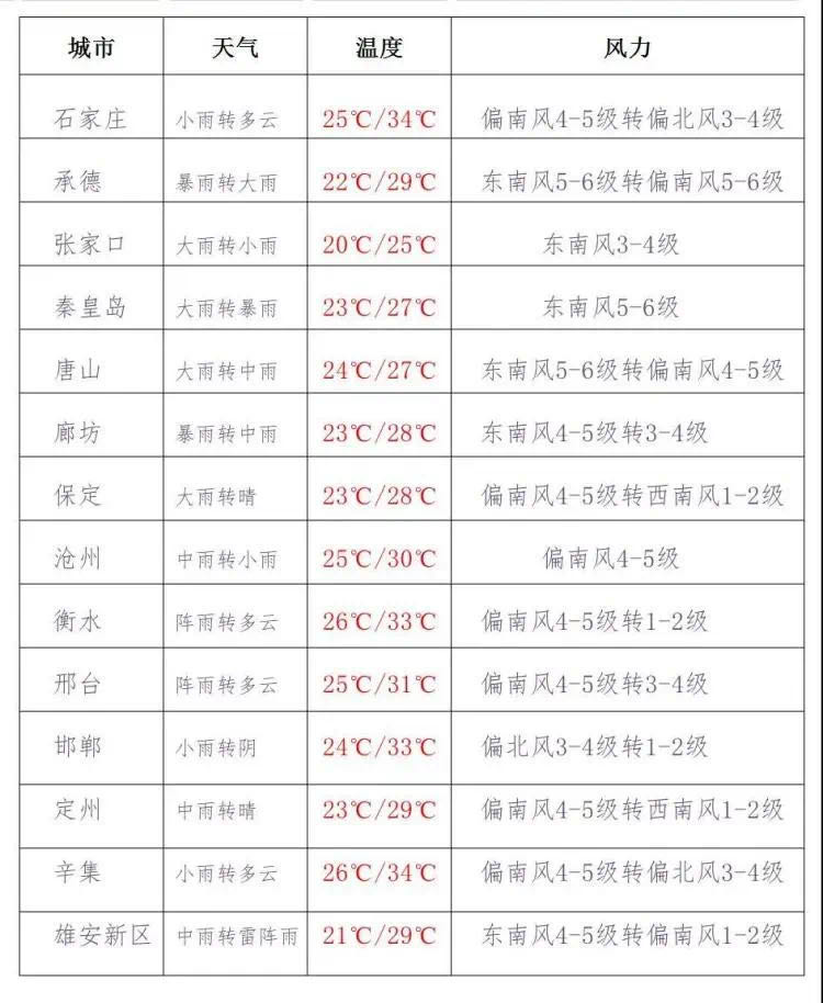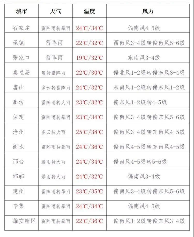 今天下午到夜間,全省多云轉陰,保定、廊坊及以南地區有大到暴雨,其中保定、雄安新區、石家莊、邢臺西部、邯鄲西部、滄州西部有大暴雨,個別地點有特大暴雨,其他地區陰有小到中雨。雷雨時局地伴有短時強降水、大風等強對流天氣。