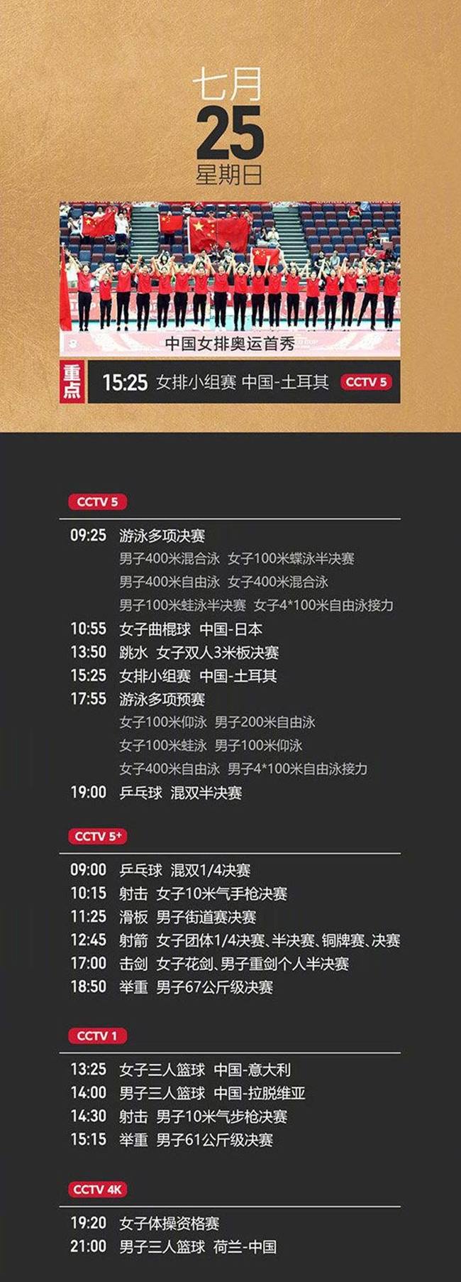 4. 今日15:25,中國女排將迎來東京奧運會首秀,對手是土耳其隊。今日賽事推薦如下: