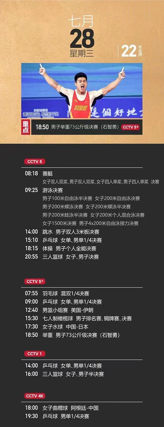 3.今日18:50將迎來男子舉重73公斤級決賽,石智勇將參賽。今日賽事推薦如下: