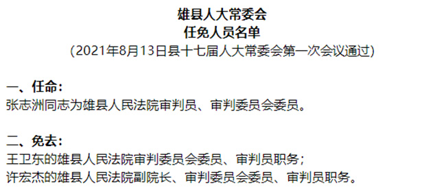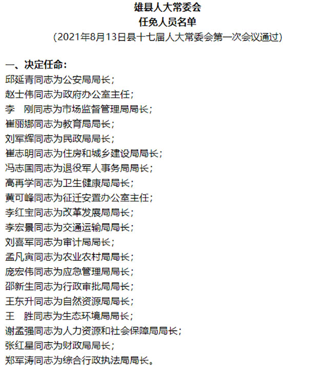 4、雄安新區雄縣13日召開十七屆人大常委會第一次會議,會上通過一批任免名單,決定任命:邱延青同志為公安局局長,趙士偉同志為政府辦公室主任等。詳情如下: