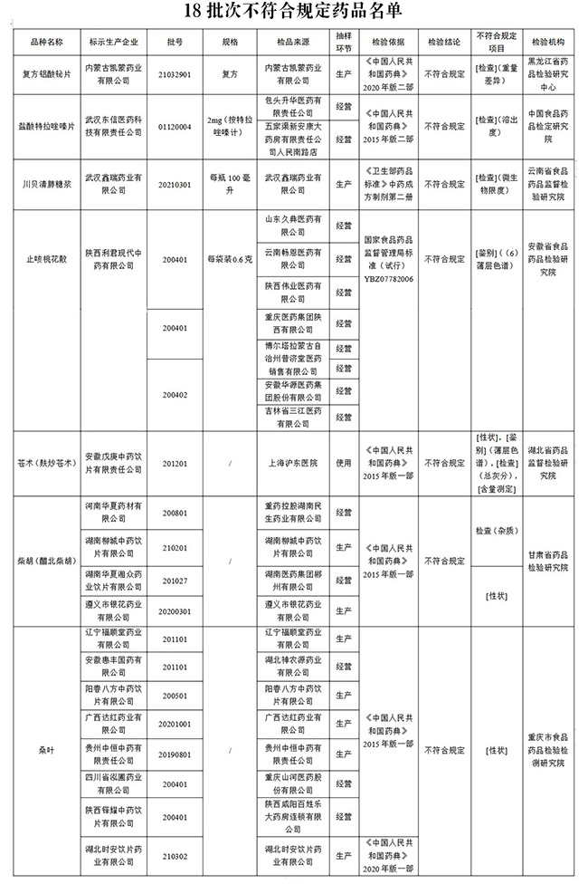 2、國家藥品監督管理局發布通告稱,標示為陜西利君現代中藥有限公司等17家企業生產的止咳桃花散等18批次藥品不符合規定。