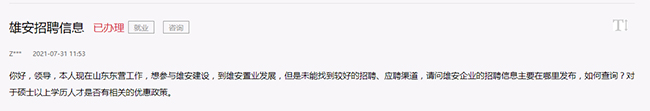 該網友留言表示:其本人目前在山東省東營市工作,想參與雄安新區建設,到雄安置業發展,但是未能找到較好的招聘、應聘渠道,想詢問雄安企業的招聘信息主要在哪里發布,如何查詢?對于碩士以上學歷人才是否有相關的優惠政策。