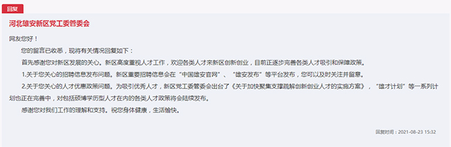 人民網雄安8月25日電 (王紅)日前,有網友在人民網“領導留言板”《雄安新區為民辦實事微心愿征集》專頁中詢問如何能夠找到雄安新區企業發布的招聘信息,以及新區對碩士以上學歷人才是否有優惠政策。雄安新區黨工委管委會通過“領導留言板”進行了說明。