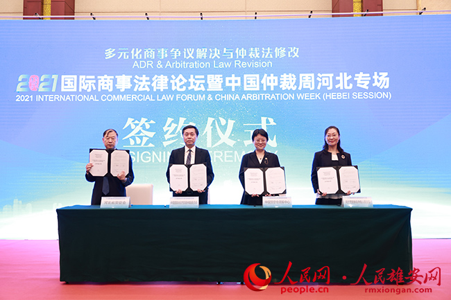 人民網雄安9月18日電 在17日舉行的“2021國際商事法律論壇暨中國仲裁周河北專場”上,雄安新區中級人民法院與中國國際經濟貿易仲裁委員會、中國國際貿易促進委員會河北省委員會、中國國際貿易促進委員會調解中心,簽署了《關于構建和完善多元化商事爭議解決機制的合作備忘錄》(以下簡稱《合作備忘錄》),推動將貿仲優勢資源、成熟的仲裁管理經驗、與國際接軌的仲裁規則和實踐引入雄安新區。
