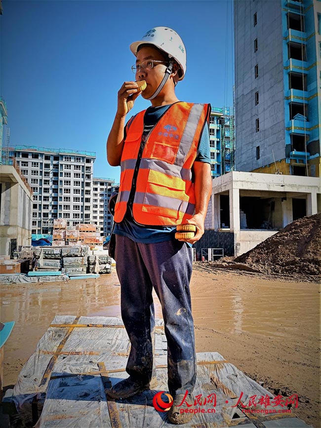 來自山東德州的孫東云是一名機械維修工,樸實的山東大哥滿身泥濘,卻是最可愛的人,吃著月餅,望著家的方向,將思念化作動力,繼續為雄安建設加油助力。
