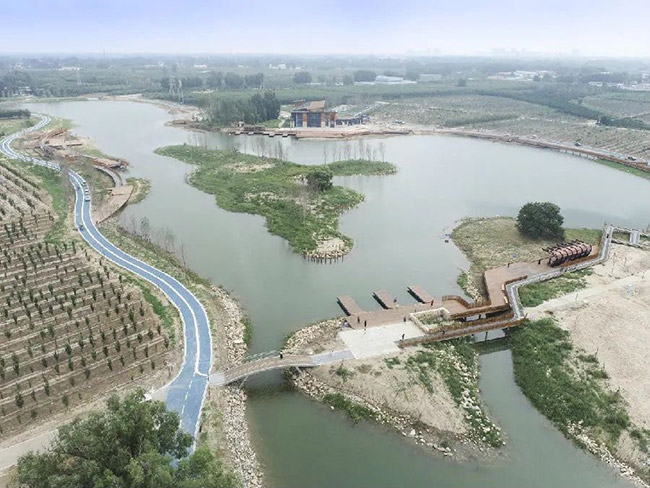 7.雄安新區“千年秀林”景觀提升工程(二期)完成生態補水工作,水位達到6.5米的設計常水位線。該工程涉及的園區水系自南向北分布,下游延伸到白洋淀,補水面積38萬平方米,補水最深可達9.0米。