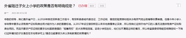 秋季學期開學前,網友“雄安新人”通過人民網“領導留言板”《雄安新區為民辦實事微心愿征集》專頁,給安新縣委書記留言,希望能解決孩子入學的問題。
