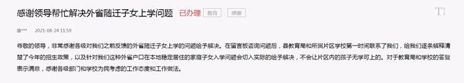 孩子入學問題解決后,網友“雄安新人”再次通過“領導留言板”表達了感謝之情:“尊敬的領導,非常感謝各級(部門)對我們之前反饋的外省隨遷子女上學的問題給予解決!彼f,“在留言板咨詢問題后,縣教育局和所屬片區學校第一時間聯系了我們,給我們逐條解釋清楚了今年的招生政策,以及針對我們這種外省戶口在本地穩定居住的家庭子女入學問題會切入實際的給予解決,不會讓片區內的孩子無學可上的。對于教育局和學校的答復表示滿意,感謝各級部門和學校為民考慮的工作態度和工作做法!