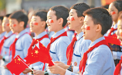 國慶假期,重慶市北碚區的小學生們高唱《歌唱祖國》。秦廷富攝(人民視覺)