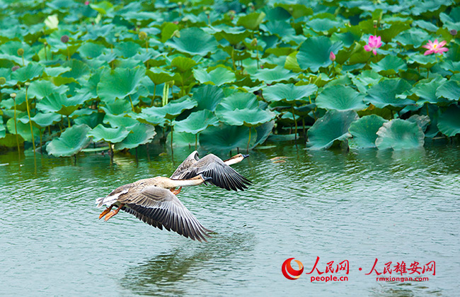 白洋淀景區水面,夏季有鳥兒嬉戲。白洋淀景區供圖