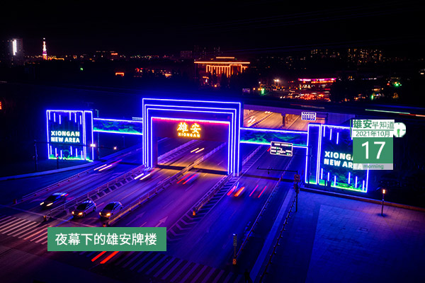 今天是2021年10月17日,星期日,天氣晴,3℃~15℃。在封面和大家見面的是夜幕下的雄安牌樓。