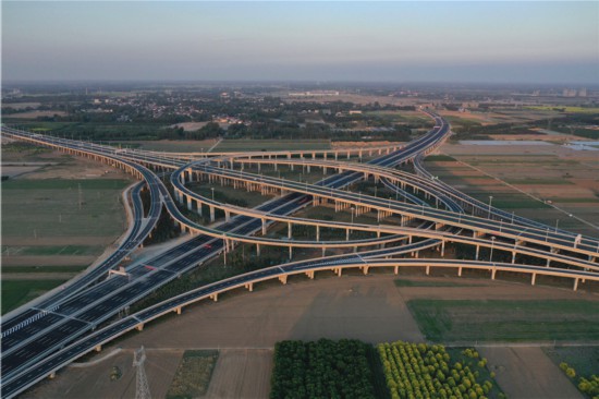 京雄高速河北段與榮烏高速新線交會的泗莊樞紐互通(5月17日攝,無人機照片)。新華社發(樊連貴 攝)