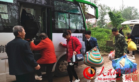 10月9日下午,大名縣萬堤鎮二集村村干部安排專車轉移群眾前往集中安置點。 人民網 朱鵬濤攝