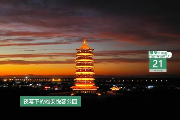 今天是2021年10月21日,星期四,天氣晴,2℃~19℃。在封面和大家見面的是夜幕下的雄安悅容公園。