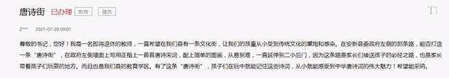 雄安新區安新縣教師發展中心教師劉艷素,在人民網領導留言板《雄安新區為民辦實事微心愿征集》專頁留言,稱希望有關部門把安新縣第二小學西側至縣人民政府東側道路打造成“唐詩街”。