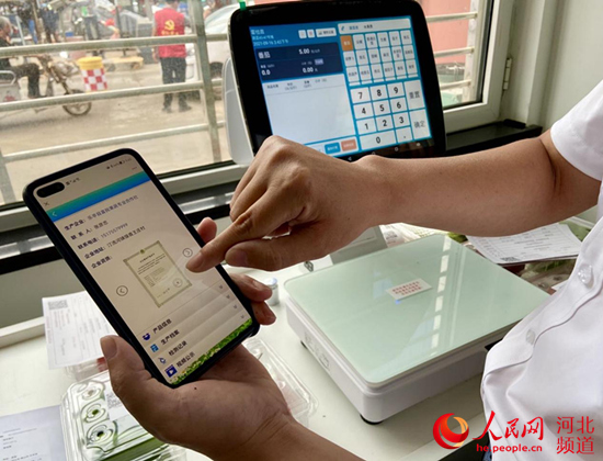 工作人員通過掃描二維碼,為大家展示蔬菜的詳細信息。 人民網 付兆颯攝