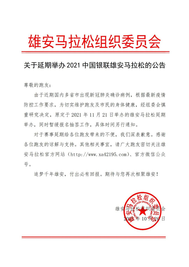 人民網雄安10月26日電 據雄安馬拉松組委會消息,由于近期國內多省市出現新冠肺炎確診病例,根據最新防控工作要求,為切實維護跑友及市民的身體健康,原定于11月21日舉辦的雄安馬拉松將延期舉辦,同時暫緩報名抽簽工作,具體時間另行通知。詳情如下↓↓↓