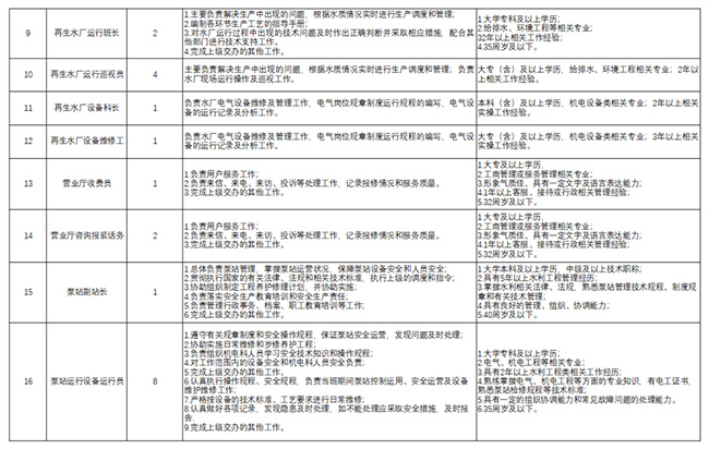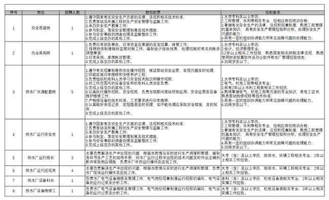 河北雄安人力資源服務有限公司根據工作需要,現面向社會公開招聘業務外包員工。工作地點在雄安新區,從事公司運營管理、供水廠運營管理、再生水廠運營管理、泵站運營管理和管網客服管理相關工作。