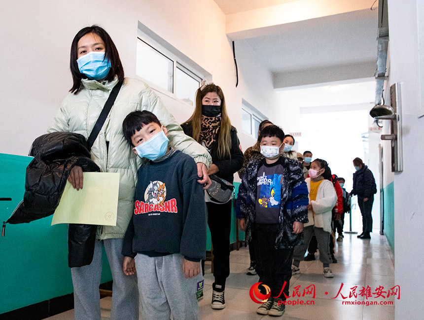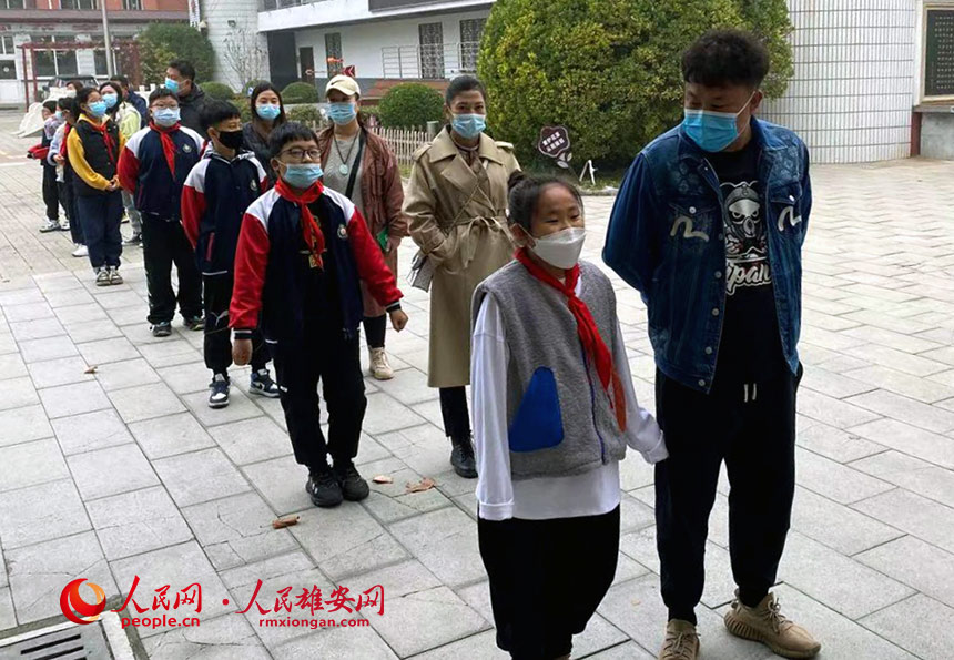 雄安新區安新縣第一小學,學生及家長正在排隊等候接種疫苗。安新縣教育局供圖