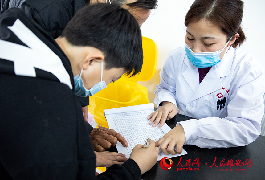 雄安新區容城縣午方北莊小學學生在注射完疫苗后進行信息登記確認。人民網 宋燁文攝