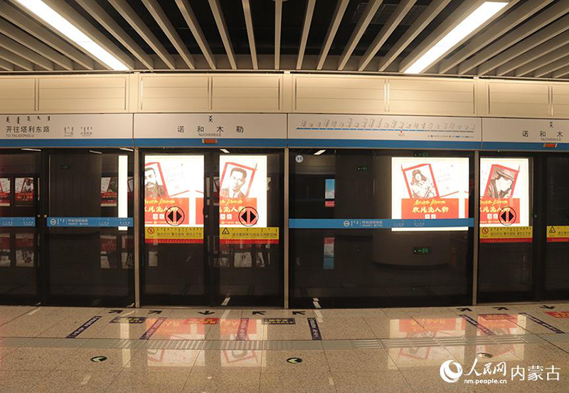 四個紅色主題站點分別位于地鐵1號線的呼和浩特東站、烏蘭夫紀念館站,地鐵2號線的內蒙古體育館站、諾和木勒站。1號線列車及站點打造“紅色記憶網上展館”主題,2號線列車及站點打造“數風流人物”主題。