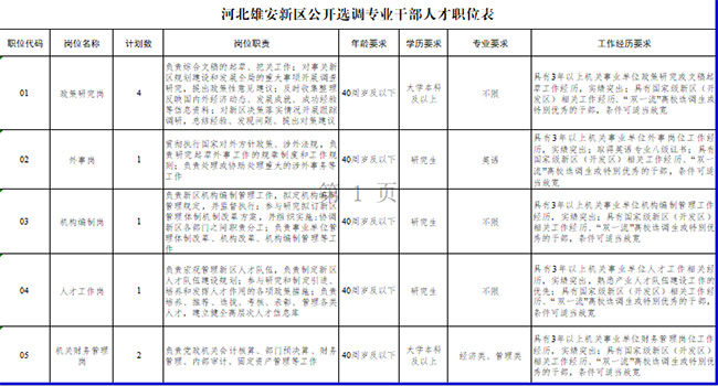 中共中央、國務院《關于支持河北雄安新區全面深化改革和擴大開放的指導意見》指出,雄安新區要“建設高端人才集聚區”,“聚天下英才而用之”。根據雄安新區建設發展工作需要,決定面向全國機關事業單位選調部分干部人才到新區工作,現將有關事項公告如下。