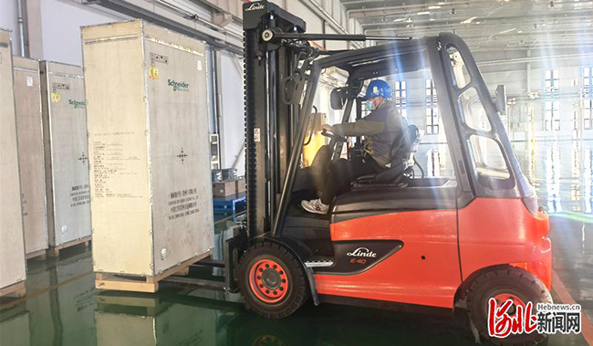 國網河北物資公司員工應用智能化叉車開展物資入庫。 李子涵攝