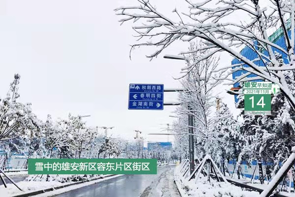 今天是2021年11月14日,星期日,天氣晴,3℃~16℃。在封面與大家見面的是雪中的雄安新區容東片區街區。