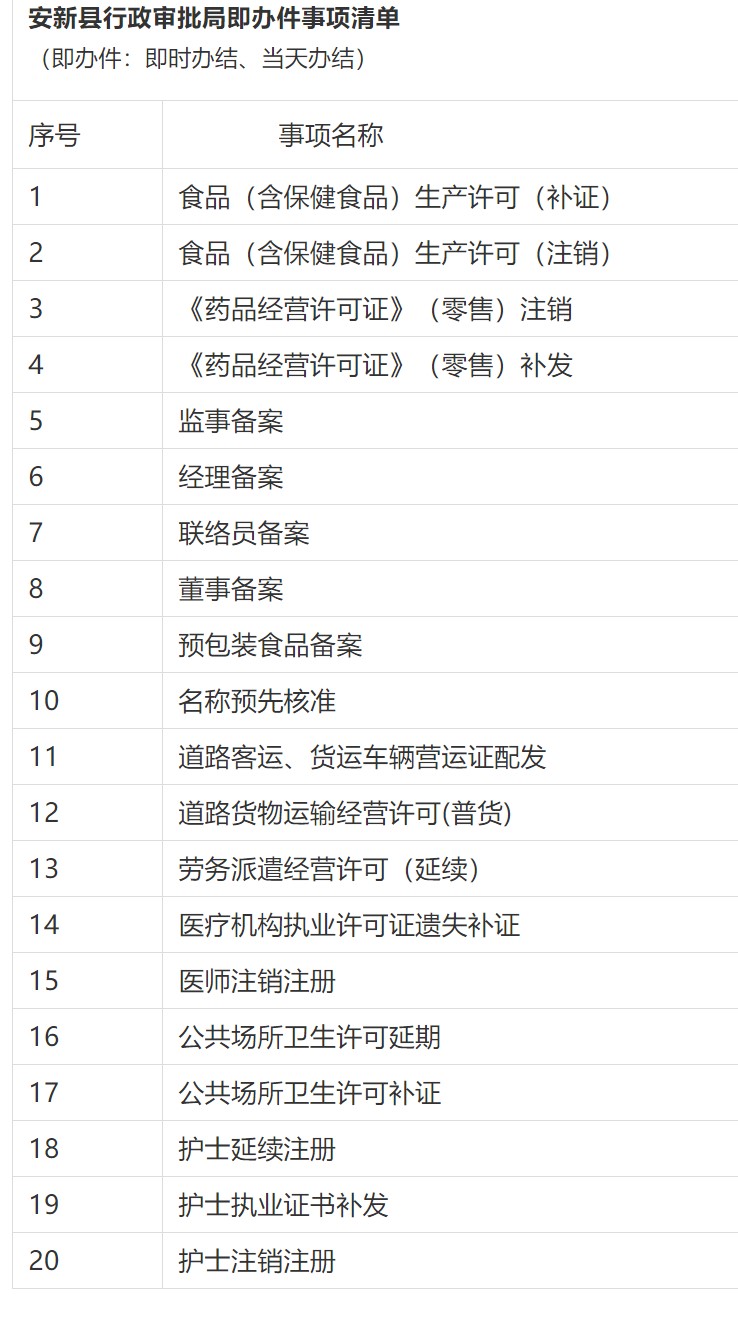 8、安新縣行政審批局推出第一批即來即辦件(即時辦結、當天辦結)事項,主要包括食品(含保健食品)生產許可(補證)、《藥品經營許可證》(零售)注銷、醫師注銷注冊等。