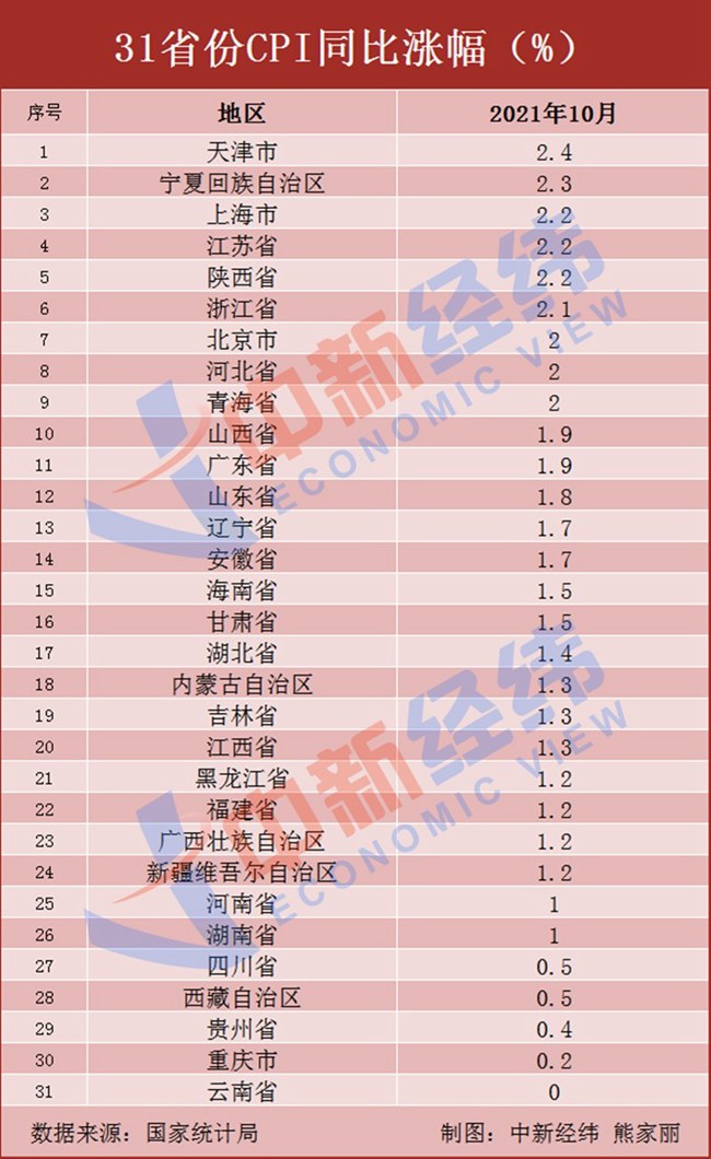1、國家統計局公布31省份10月CPI數據顯示,湖北、內蒙古、吉林、江西、黑龍江、福建、廣西、新疆、河南、湖南、四川、西藏、貴州、重慶、云南15省份10月CPI同比漲幅低于全國平均水平。其中,云南10月CPI漲幅為0,與去年同期持平。