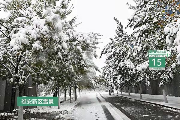 今天是2021年11月15日,星期一,天氣多云,-1℃~13℃。在封面和大家見面的是雪中的雄安新區。