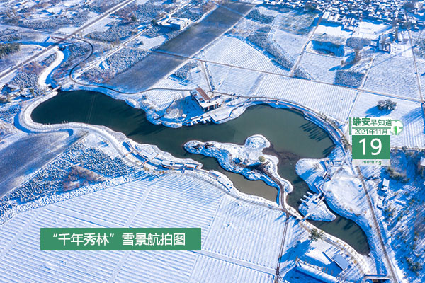 今天是2021年11月19日,星期五,天氣陰 ,3℃~8℃。在封面和大家見面的是雄安“千年秀林”雪景航拍圖。