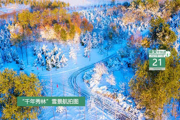 今天是2021年11月21日,星期日,天氣晴,-3℃~8℃。在封面和大家見面的是“千年秀林”雪景航拍圖。