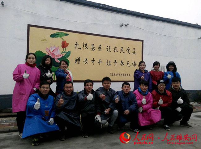 田迎賓(前排左3)同其他大學生村官為七間房鄉西大塢三村、四村繪制文化墻。七間房鄉人民政府供圖
