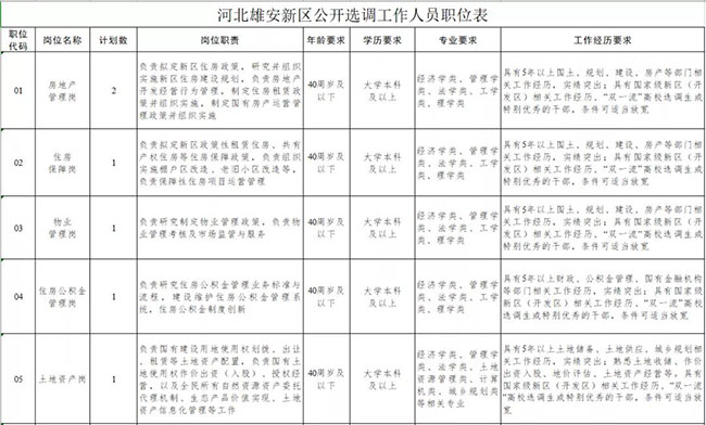 這是從河北雄安新區黨工委管委會黨群工作部發布的《河北雄安新區公開選調工作人員公告》中獲悉的。本次選調共設置房地產管理崗、住房保障崗、物業管理崗等8個崗位。