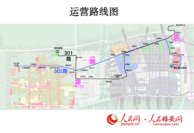 據了解,301路設置白洋淀站、金三角北、金三角、1號CEC、白塔站、悅容公園、雄安國際酒店南門、悅容小學、和諧園、錦繡園、清荷園(東行)、寬余園、春華庭、豐潤庭、榆梅苑、3號CEC、雄安郊野公園17個站點;302路設置大水大街辦公區、興容檢測線、立成飯店、容城汽車站、新北花園A區、博奧學校、樂民街西口、4號CEC、明珠園、清荷園、寬余園、春華庭、豐潤庭、榆梅苑、紅楓苑、丹若苑、南文路口(東行)、弘文花園、居賢花園、南文營公交站20個站點。301路、302路公交均為雙向發車。