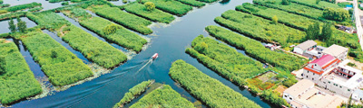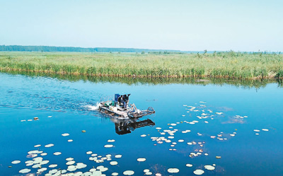 一艘打撈船在白洋淀景區內清理漂浮物。