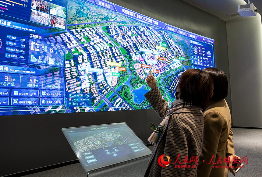 觀眾在參觀雄安·容東智慧體驗中心展示屏幕。人民網 宋燁文攝