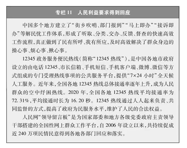 《中國的民主》白皮書提到,“對于涉及自身利益的實際問題,人們通過信訪平臺、領導信箱、政務熱線、網絡‘留言板’等提出意見和訴求,能夠得到及時反饋和回應!