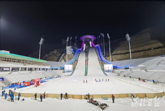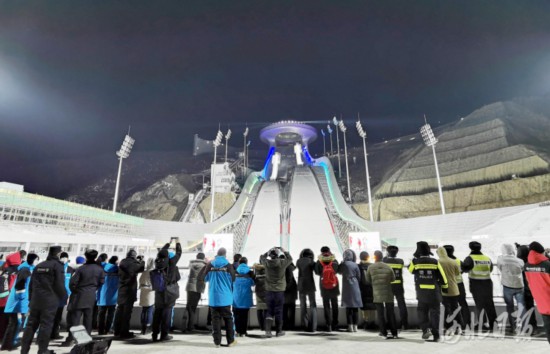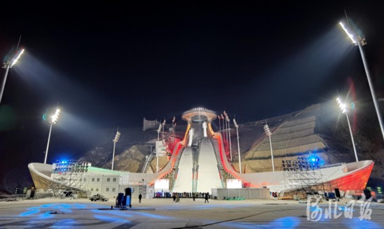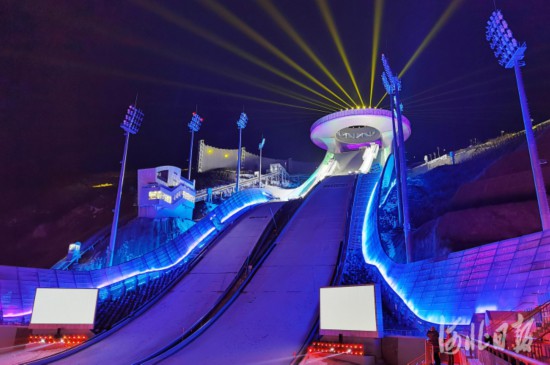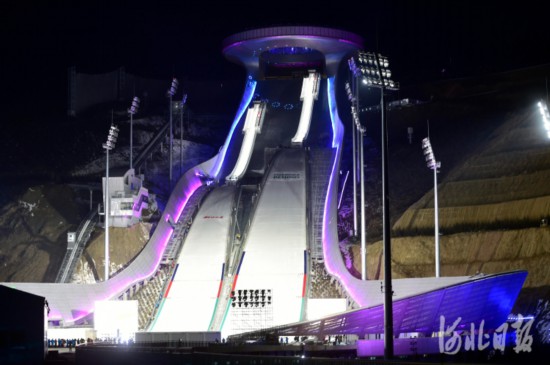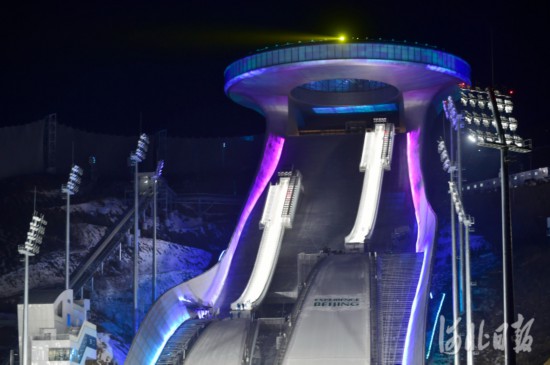 2021年12月4日,國家跳臺滑雪中心在燈光映射下流光溢彩熠熠生輝,“雪如意”魅力十足。河北日報記者張昊攝影報道