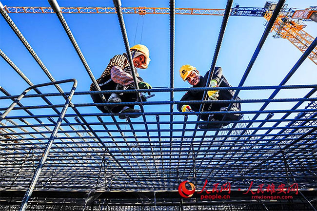來自四川涼山的彝族夫婦阿西阿古、阿的阿呷正在進行鋼筋綁扎作業。高空作業雖累,但兩人做得很認真。
