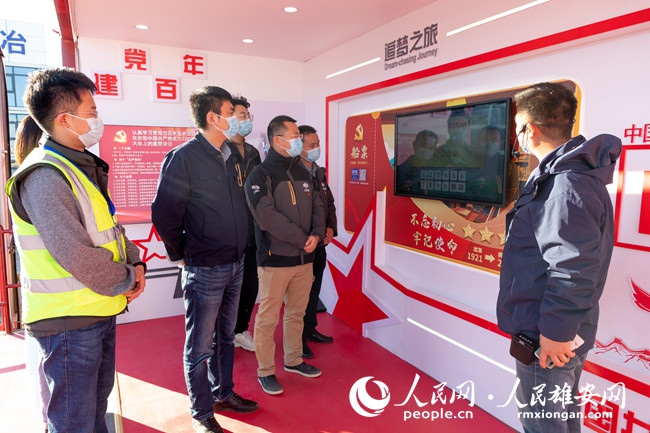 2021年11月,雄安“黨史學習教育”紅色大篷車巡展活動走進項目建設現場,眾多建設者紛紛登車參觀學習。項目黨支部還組織集體觀看《長津湖》等紅色電影作品,全年共舉辦12次主題黨日活動,不斷豐富黨史學習教育形式載體。